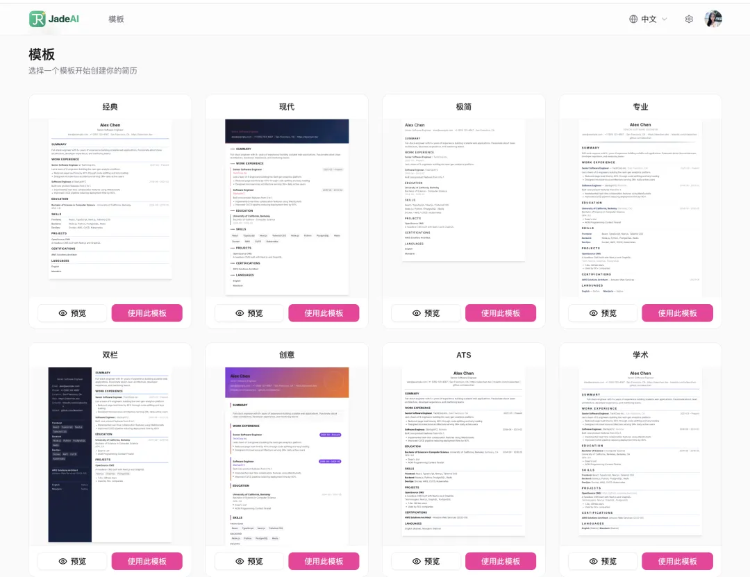 内置 50 套专业设计模板,覆盖经典、现代、极简、创意、ATS 友好、北欧风、瑞士风、日式等多种风格,适配不同行业和求职场景。