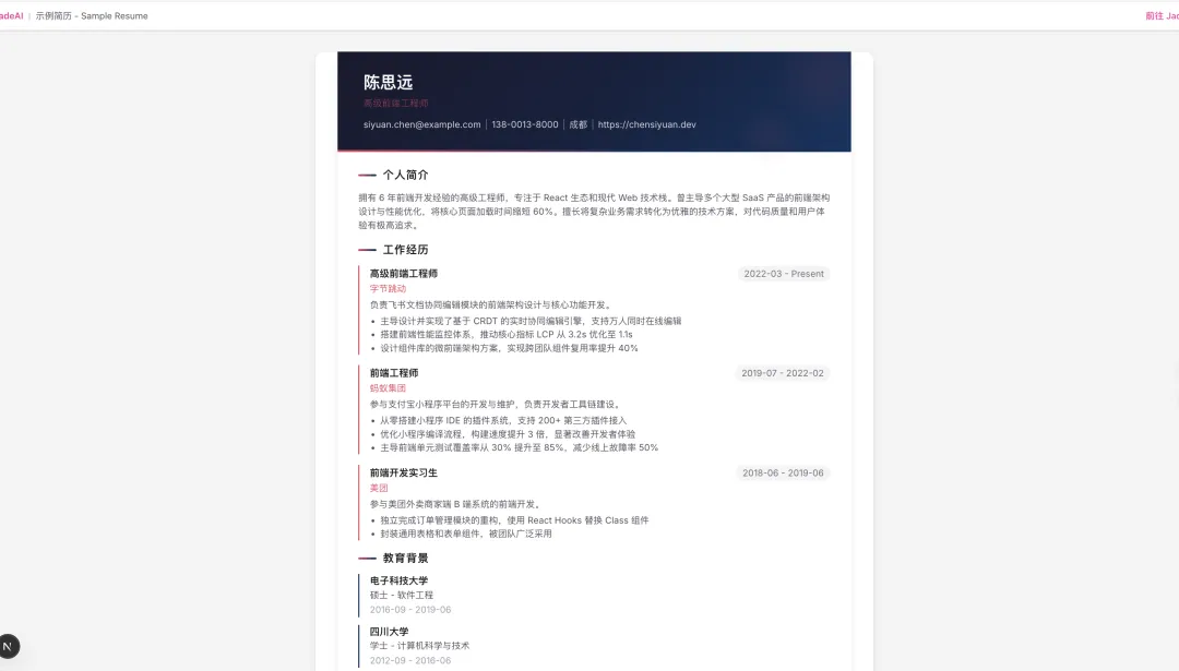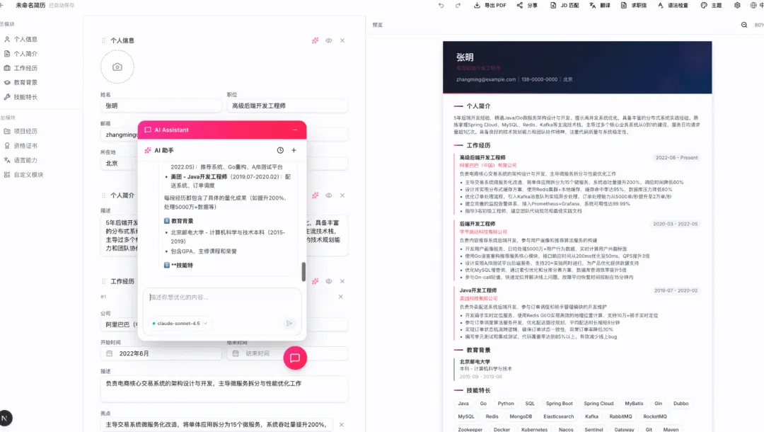 输入你的目标职位、工作年限和核心技能,AI 自动生成一份完整的、结构化的简历。不用对着空白页发愁了。