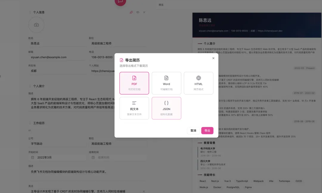 支持 PDF、DOCX、HTML、TXT、JSON 五种格式导出。PDF 使用 Puppeteer + Chromium 服务端渲染,高保真还原模板样式,每套模板都有独立的导出处理器。