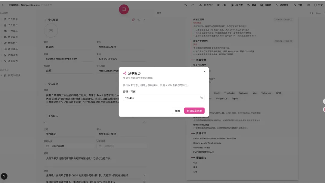 生成一个分享链接,可以直接发给 HR 或朋友查看你的在线简历。支持密码保护和浏览次数统计。