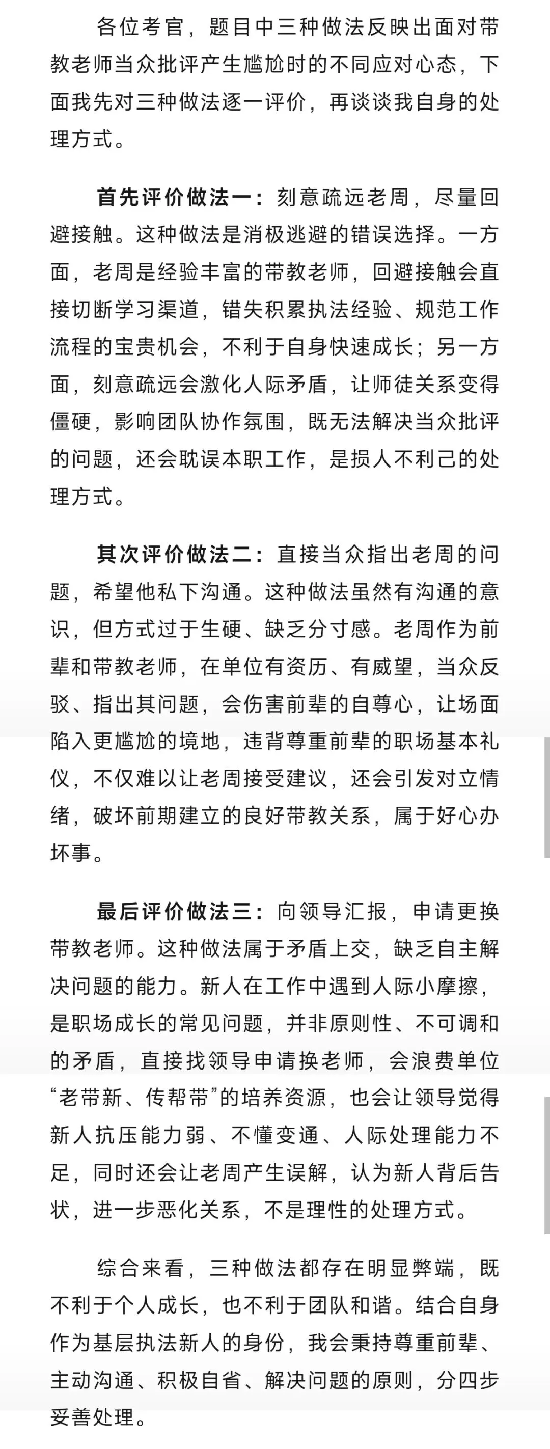 单位开展"老带新,传帮带"活动,老周经验丰富的,成为了你的带教老师。他在工作中给予了你很多指导,但他习惯在大庭广众之下直接批评你,让你感到尴尬。面对这种情况,有以下三种做法:请评价这三种做法,并结合自身实际,谈谈你会如何处理?(我觉得机构的答案还行,就是太啰嗦了以及语言比较刻板,没能借机充分展示自己的人品和情商)
