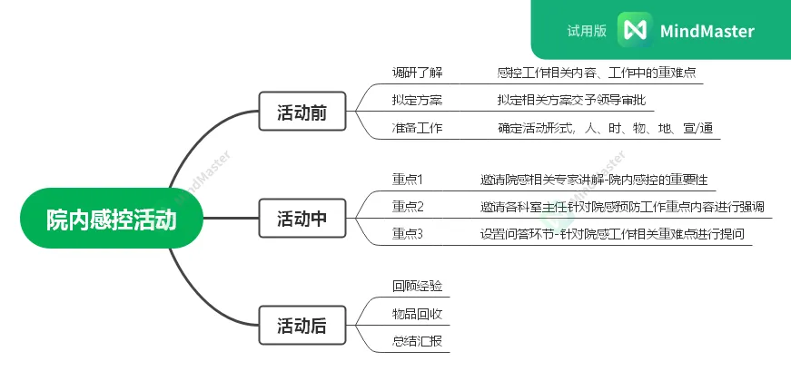 在活动前,首先我会调研了解感控工作相关内容,工作当中的重难点等等;其次我会拟定方案交予领导审批;在确定本次活动形式为院内感控相关宣讲会后,我会确定好本次参与的相关人员,活动时间,以及准备好物资物料,确定好活动地点,做好前期的通知工作,保障活动顺利有效进行。