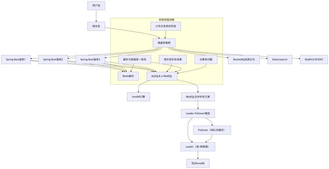在数据库方面,小红书使用 MySQL 8.x 版本,并自研了 RedSQL 数据库内核。这个内核最引人注目的创新是合并秒杀方案,通过将多个事务 SQL 合并到一个事务进行提交,将秒杀写入能力提升 5 倍至 1.5W/s+,相比开源 MySQL 版本有百倍性能提升。这个方案采用 Leader-Follower 模型,当多个请求同时抢同一行库存时,系统会自主选出一个 leader 负责读取和更新数据,其他 follower 的请求不再去争抢行锁,而是排队修改 leader 存下来的缓存,最后 leader 再一次性把合并后的结果写回 InnoDB。