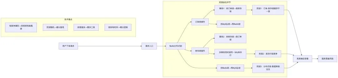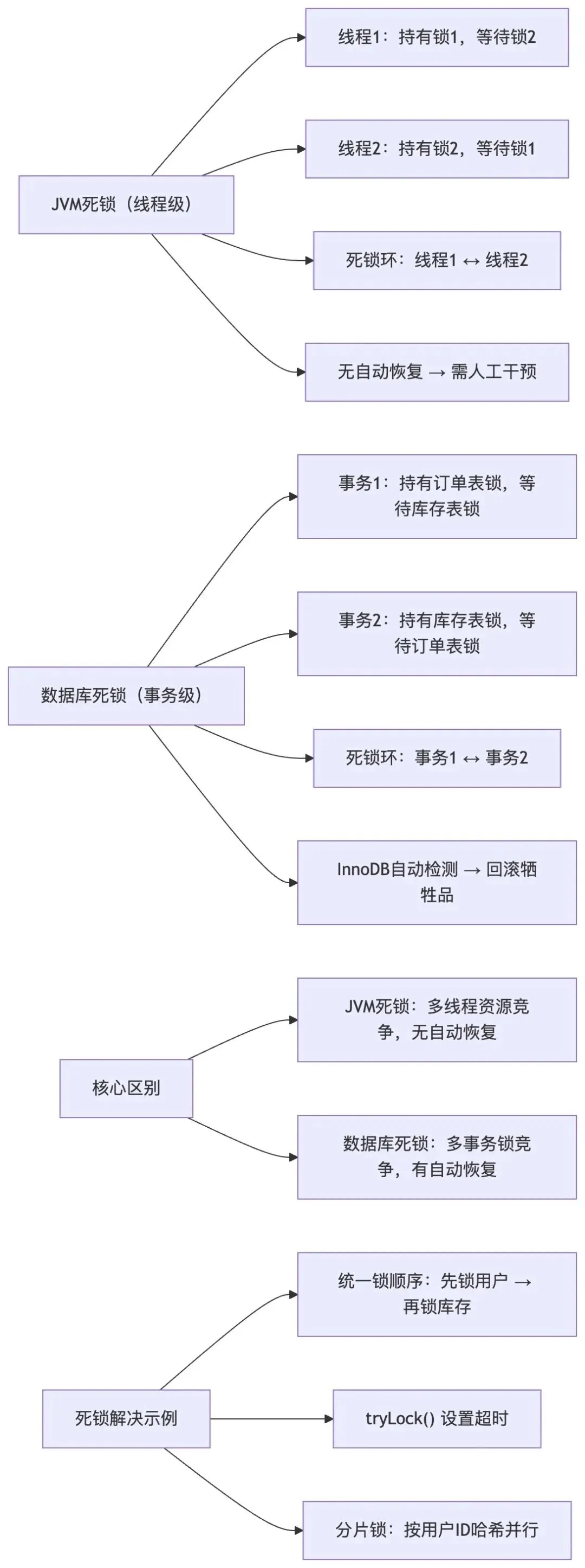 - 订单创建与库存扣减的死锁:多个事务同时尝试更新订单表和库存表,但加锁顺序不一致