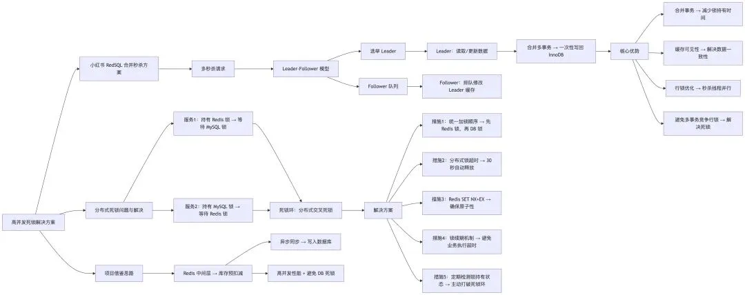 "根据我对小红书技术博客的了解,合并秒杀方案采用了 Leader-Follower 模型。当多个请求同时访问同一行库存时,系统会选出一个 leader,由它负责读取和更新数据,其他 follower 的请求不再去争抢行锁,而是排队修改 leader 存下来的缓存,最后 leader 再一次性把合并后的结果写回 InnoDB。这种设计从根本上避免了多个事务同时竞争行锁的问题。"