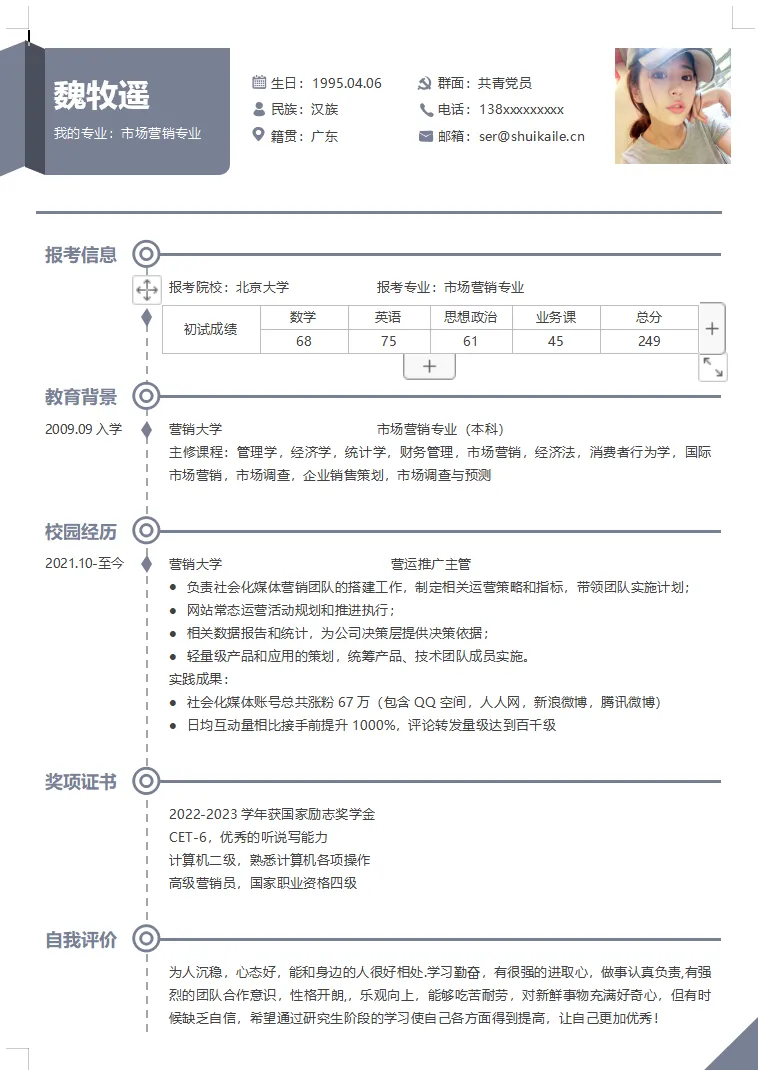 1.基本信息:在简历的开头,要写上你的基本信息,包括姓名、性别、出生年月、电话、邮箱等,确保联系方式准确无误。