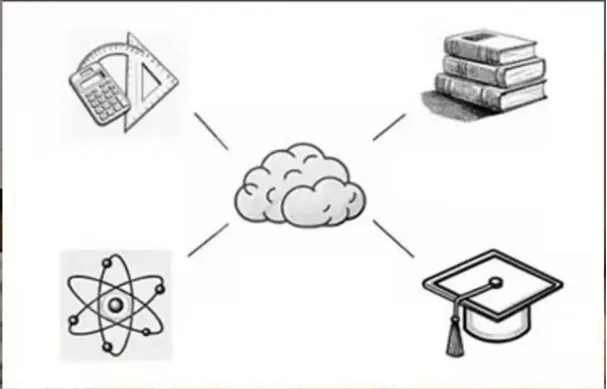 首先,观察可知题干中包含以下元素:直尺(代表数据与精准)、书本(代表着知识与专业)、行星(代表着天文知识)、计算器(代表着计算与效率),而这些所有的要素都围绕着大脑,以一个大脑为核心,所以我们通过拆分与结合相理解就可知,这些所有的要素都能够被这个大脑所囊括,且大脑才是最核心的要素。
