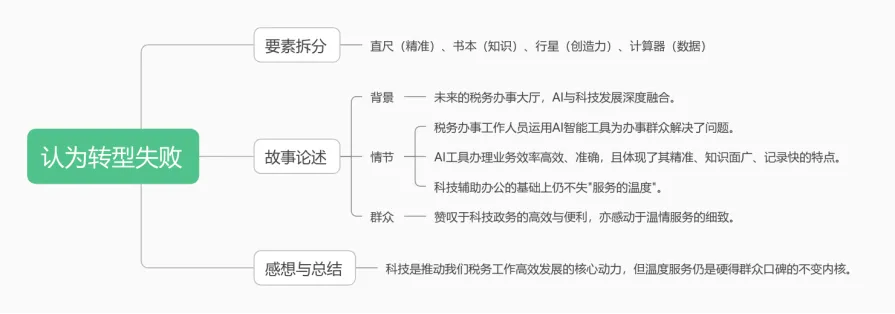 那么根据当前的热点来看,这个大脑可以代表着AI大脑,那么我们的故事就可以将AI运用与具体税务工作相结合起来理解,完全可以畅想一个故事来进行解答,畅想在10年后,AI大脑运用到政务实际工作中,提高工作精准度与效率,得到办事人员好评的案例故事,以及自己的感受。据此,答题框架就搭建起来了。