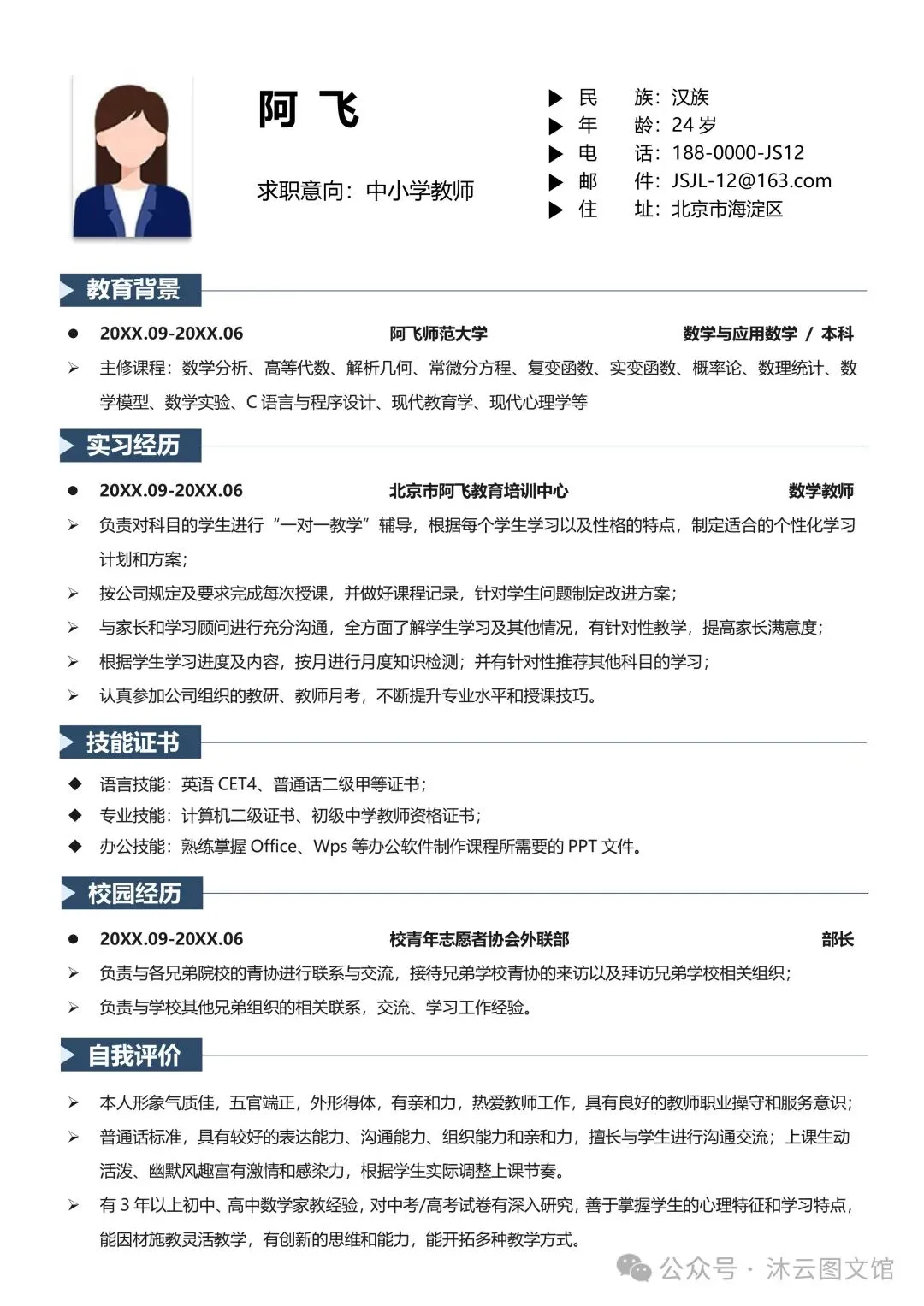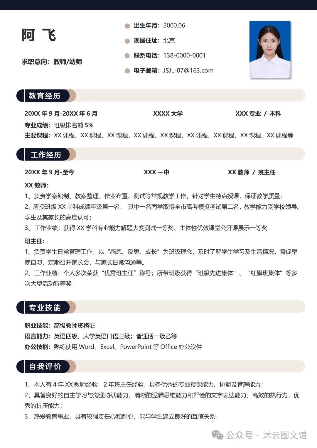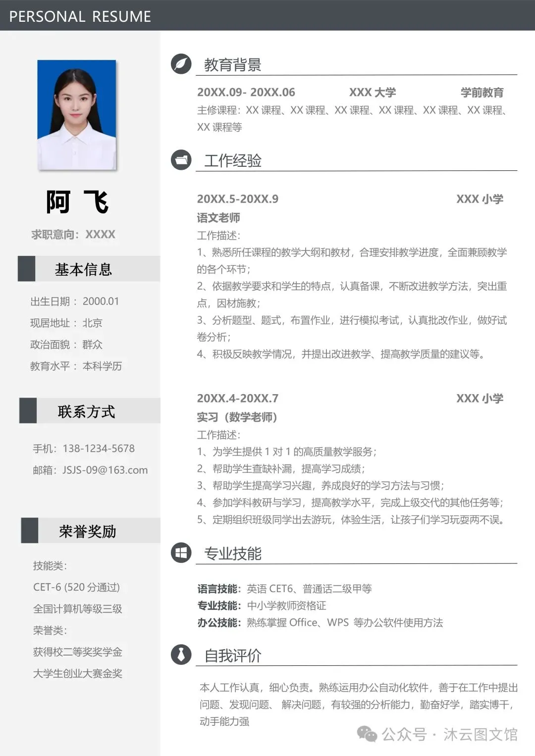超简约清新中小学教师个人简历模板来啦!还在为求职简历不够专业而烦恼?教师岗位竞争激烈,如何在众多候选人中脱颖而出?这份专为教育工作者设计的清新简约简历模板,以“高效传递价值”为核心,助您用一页纸的篇幅,精准展现教学能力与职业素养!🌟✅ 聚焦核心优势:摒弃冗长堆砌,浓缩教育背景、教学成果、专业技能三大模块。突出师范院校背景、主修课程、获奖经历,用数据量化教学成绩(如“班级升学率提升20%”“开发3门校本课程”),让招聘方10秒抓住重点。✅ 设计赋能专业:莫兰迪色系搭配留白艺术,低调中彰显知性气质;模块化排版逻辑清晰,标题栏嵌入书本/黑板手绘图标,呼应教育行业属性。字体选用楷体与无衬线体结合,兼顾人文温度与阅读效率。✅ 灵活适配场景:中小学教师可强化课堂管理、家校沟通案例;高校教师侧重科研项目与论文发表;职称评审增加培训进修、赛课奖项等内容。附赠教学理念金句库,助您用“用爱浇灌,静待花开”等点睛之笔打动评委。✅ 高效实用细节:支持Word/WPS双版本编辑,手机电脑同步操作;内嵌智能对齐参考线,小白也能轻松排版。