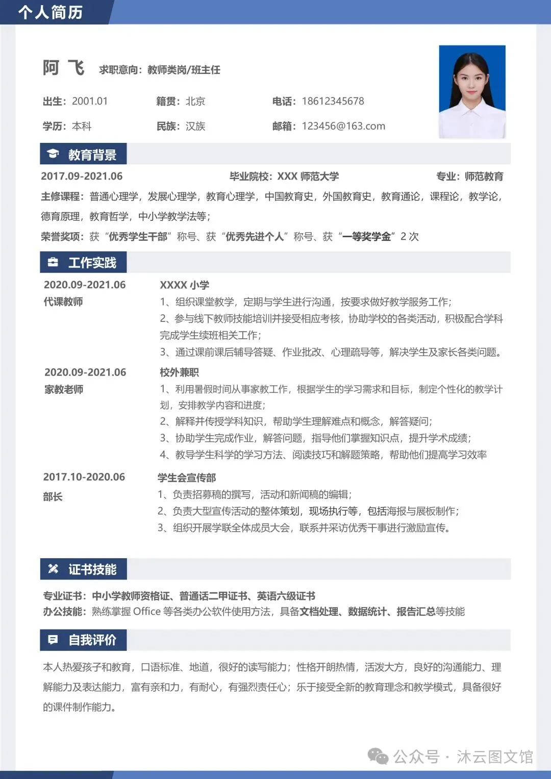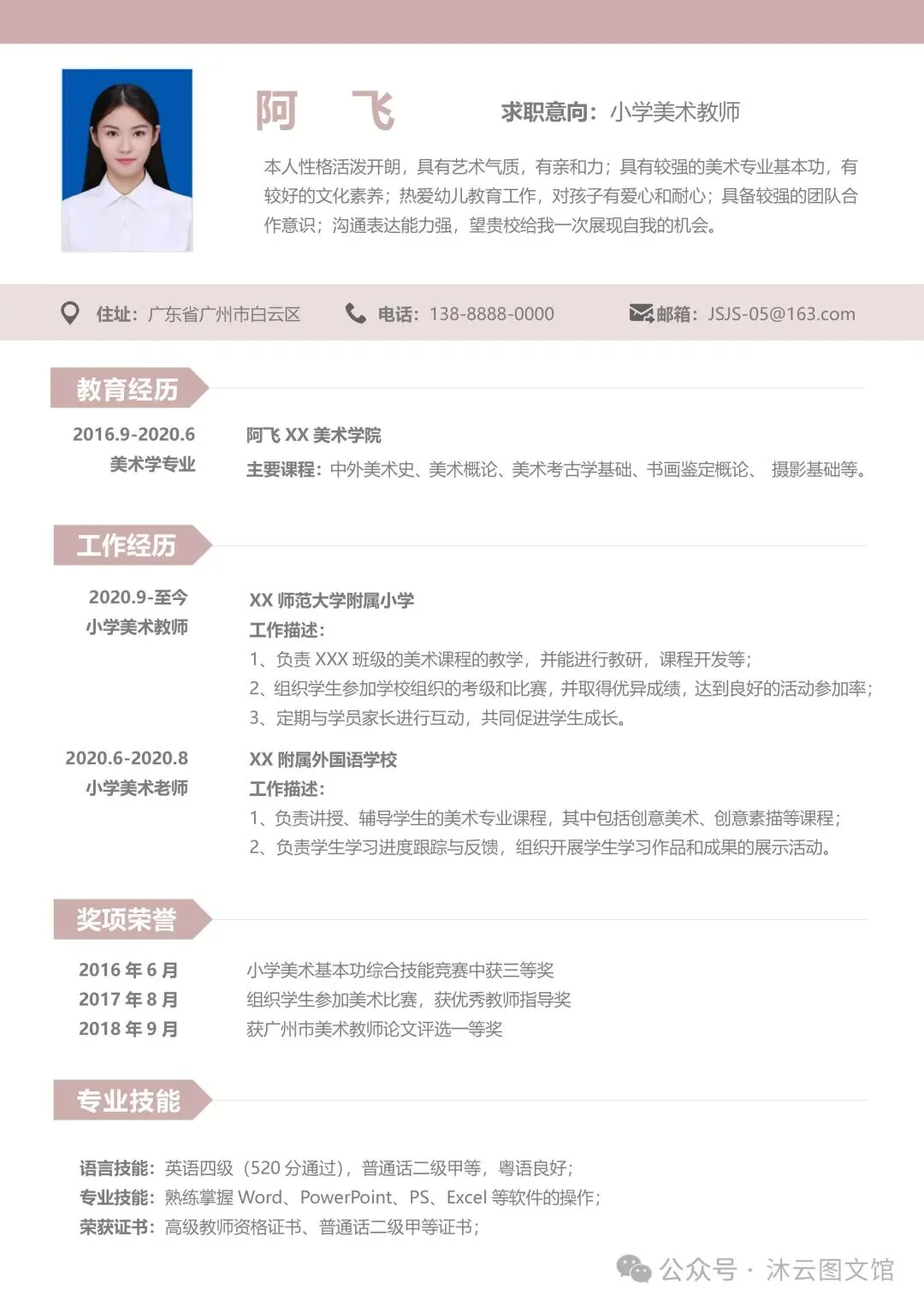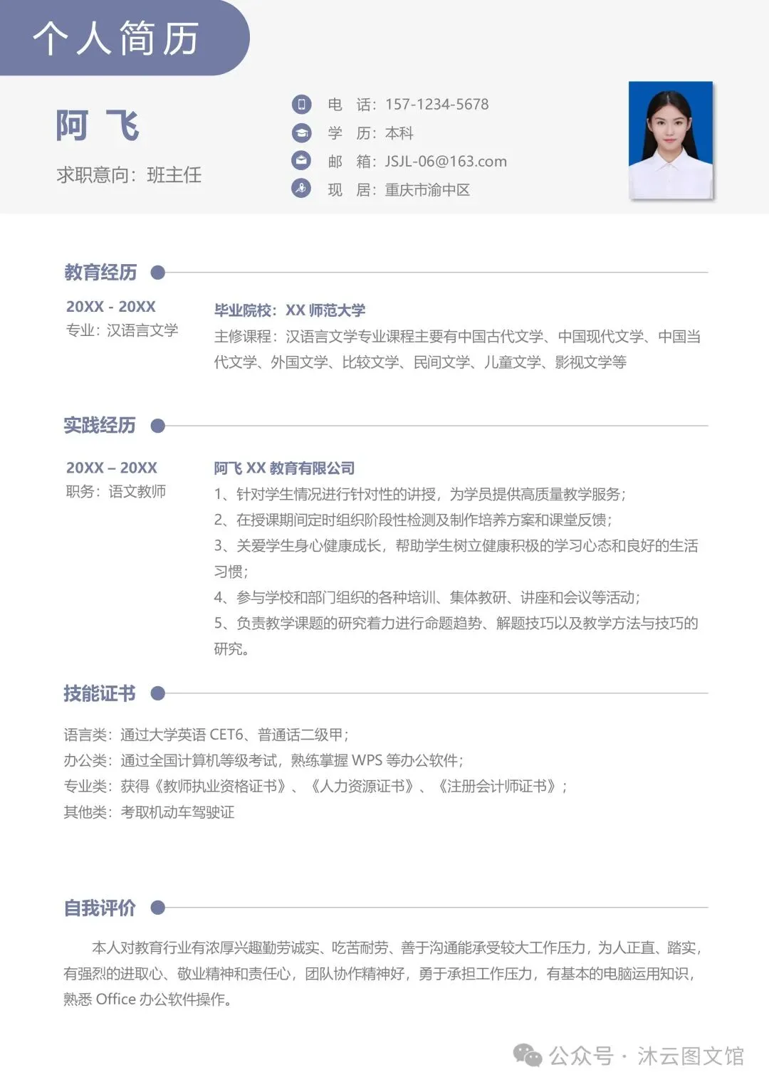 超简约清新中小学教师个人简历模板来啦!还在为求职简历不够专业而烦恼?教师岗位竞争激烈,如何在众多候选人中脱颖而出?这份专为教育工作者设计的清新简约简历模板,以“高效传递价值”为核心,助您用一页纸的篇幅,精准展现教学能力与职业素养!🌟✅ 聚焦核心优势:摒弃冗长堆砌,浓缩教育背景、教学成果、专业技能三大模块。突出师范院校背景、主修课程、获奖经历,用数据量化教学成绩(如“班级升学率提升20%”“开发3门校本课程”),让招聘方10秒抓住重点。✅ 设计赋能专业:莫兰迪色系搭配留白艺术,低调中彰显知性气质;模块化排版逻辑清晰,标题栏嵌入书本/黑板手绘图标,呼应教育行业属性。字体选用楷体与无衬线体结合,兼顾人文温度与阅读效率。✅ 灵活适配场景:中小学教师可强化课堂管理、家校沟通案例;高校教师侧重科研项目与论文发表;职称评审增加培训进修、赛课奖项等内容。附赠教学理念金句库,助您用“用爱浇灌,静待花开”等点睛之笔打动评委。✅ 高效实用细节:支持Word/WPS双版本编辑,手机电脑同步操作;内嵌智能对齐参考线,小白也能轻松排版。