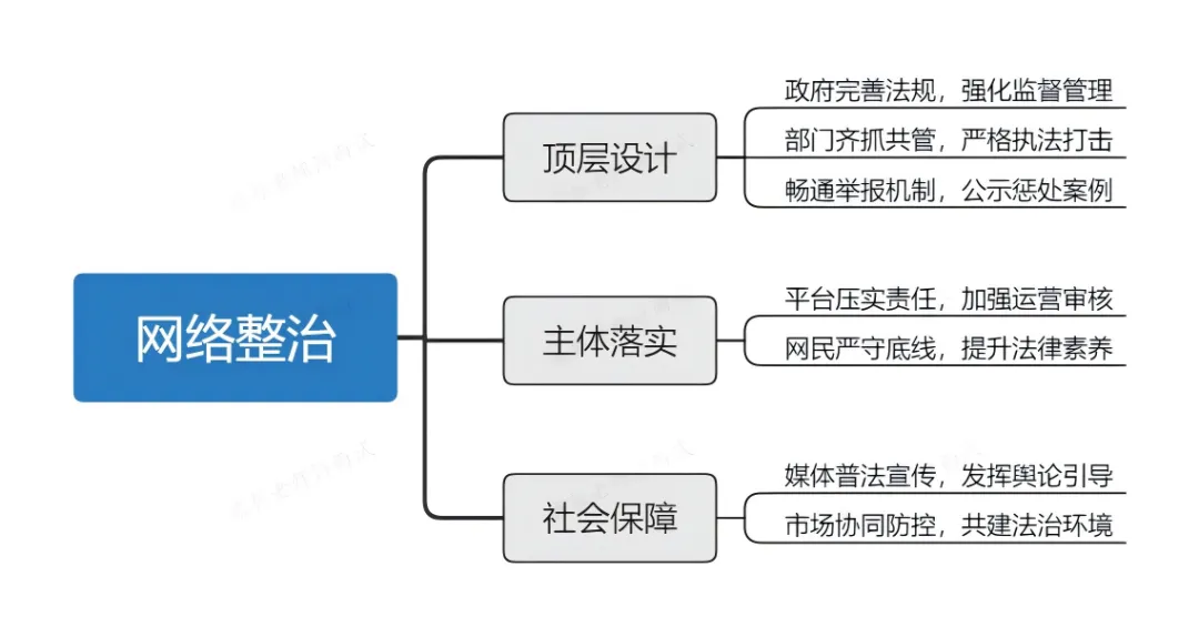 建设法治社会要求“科学立法、严格执法、公正司法、全民守法”,强调多元主体协同参与,以实现和谐稳定的社会环境,使“尊法、学法、守法、用法”成为社会共识,夯实全面依法治国的社会基础。为了整治社交平台上“网络水军”现象,我认为可以从几个方面来综合施策。