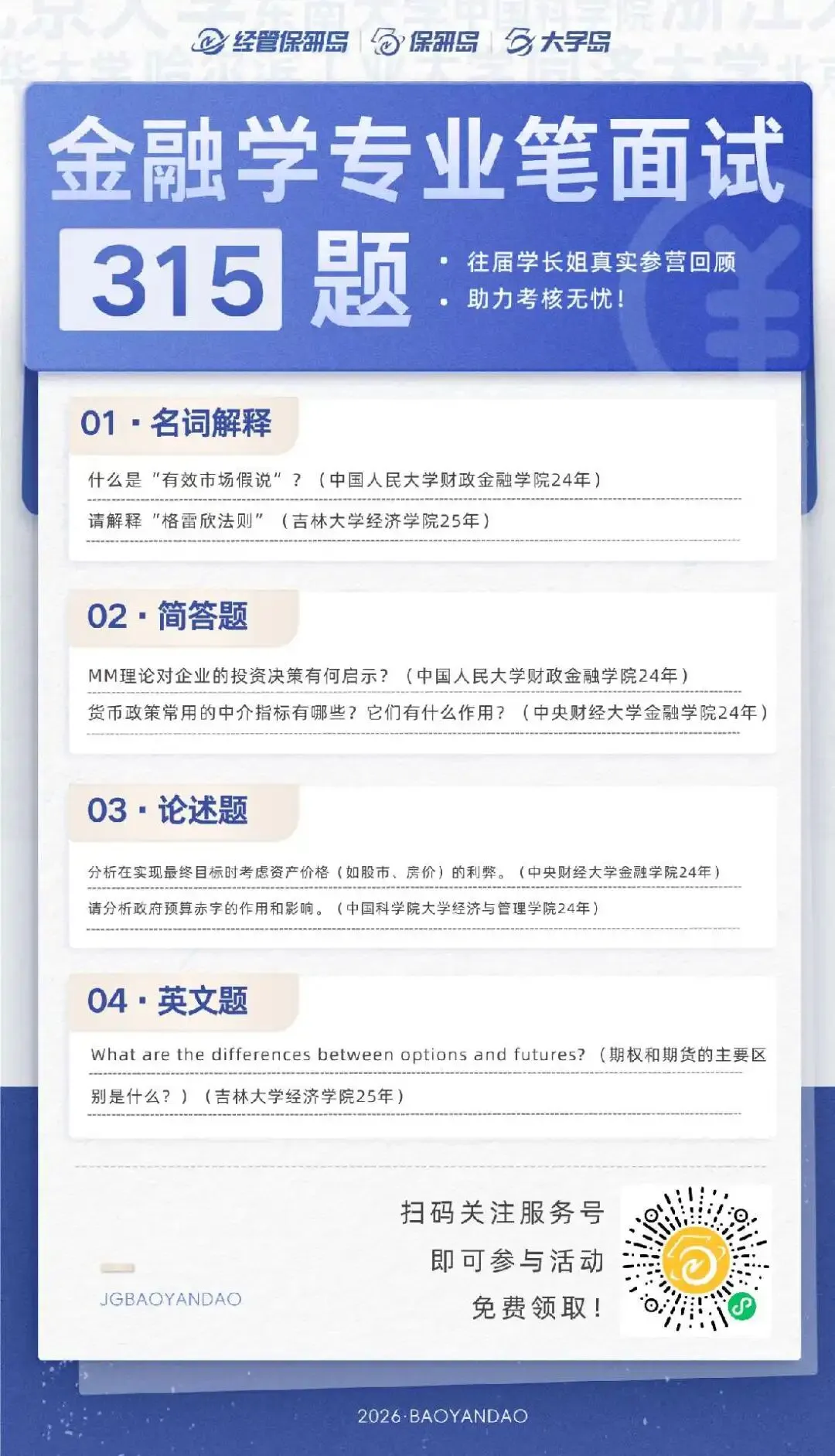 基本来说,金融学专业基本以笔面试的方式来进行考核,内容涵盖金融学、经济学、会计学等多个方面。笔试准备需要更加全面的知识体系,注重基础理论的掌握,而面试有时会围绕你的研究方向与参营论文进行深挖,有时也会采取知识点抽题的方式进行。