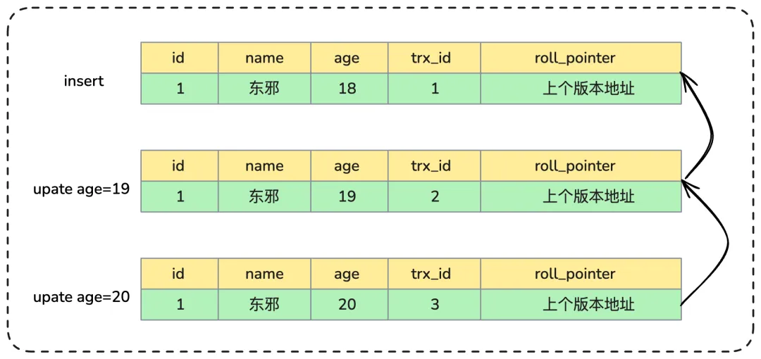 当一个事务要修改某行数据时,InnoDB不会直接覆盖原始数据,而是会把原始数据拷贝一份到undo log里,然后修改原始数据,并记录下当前操作的事务ID。这样,一行数据就可能存在多个版本,通过回滚指针串成一个版本链。