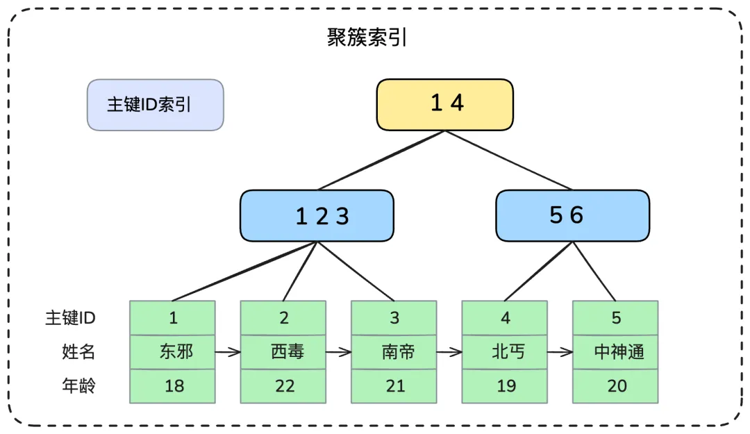 CREATETABLE`user` (`id`intCOMMENT'主键ID',`name`varchar(10) COMMENT'姓名',`age`intCOMMENT'年龄', PRIMARY KEY (`id`)) ENGINE=InnoDBCHARSET=utf8 COMMENT='用户表';聚簇索引如下图: