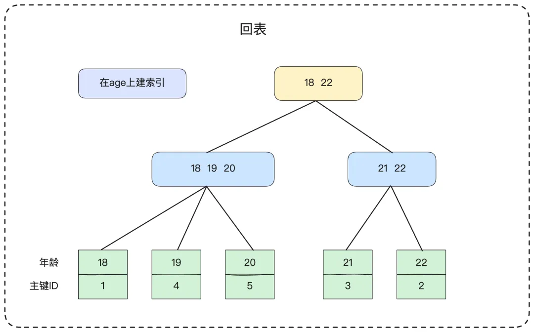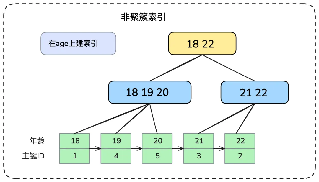 非聚簇索引,也叫二级索引或辅助索引,它是“索引和数据分开的”。它的叶子节点存储的不是完整的行数据,而是索引列的值和对应行的主键ID。当我们用非聚簇索引查询时,如果需要获取完整的行数据,就需要先通过这个索引找到主键ID,然后再用主键ID去聚簇索引里把完整的数据捞出来,这个过程就叫“回表”。