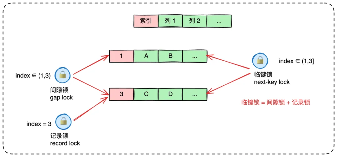对于当前读(比如SELECT ... FOR UPDATE):它通过 间隙锁(Gap Lock)和临键锁(Next-Key Lock) 来解决。当我们执行一个范围查询并加锁时,InnoDB不仅会锁住满足条件的记录本身(记录锁),还会锁住这些记录之间的“间隙”,防止其他事务在这个间隙里插入新的数据。这样一来,也就防止了幻读的发生。