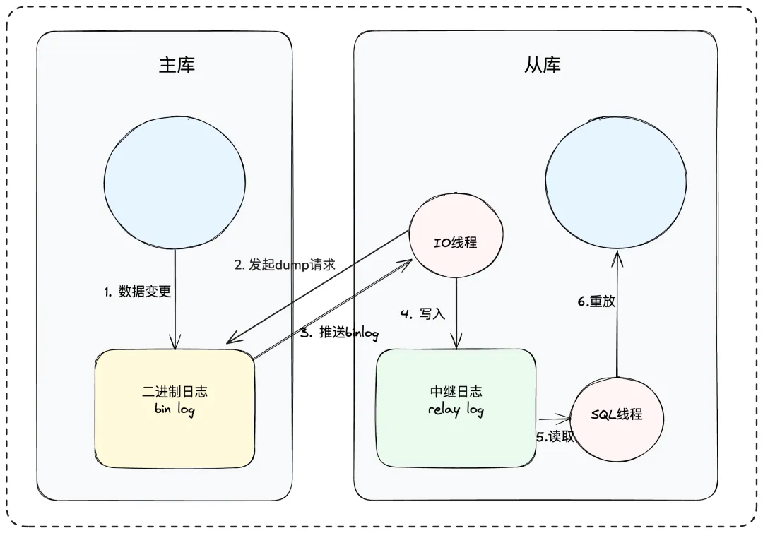 主库记录变更:主库上所有对数据的修改操作,都会被记录到自己的Binlog(二进制日志)文件中。