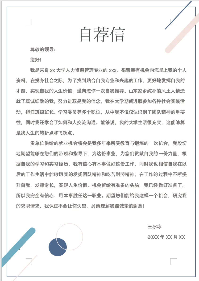 适用人群:复合型人才、学术型求职或需要附带自荐信的场合。