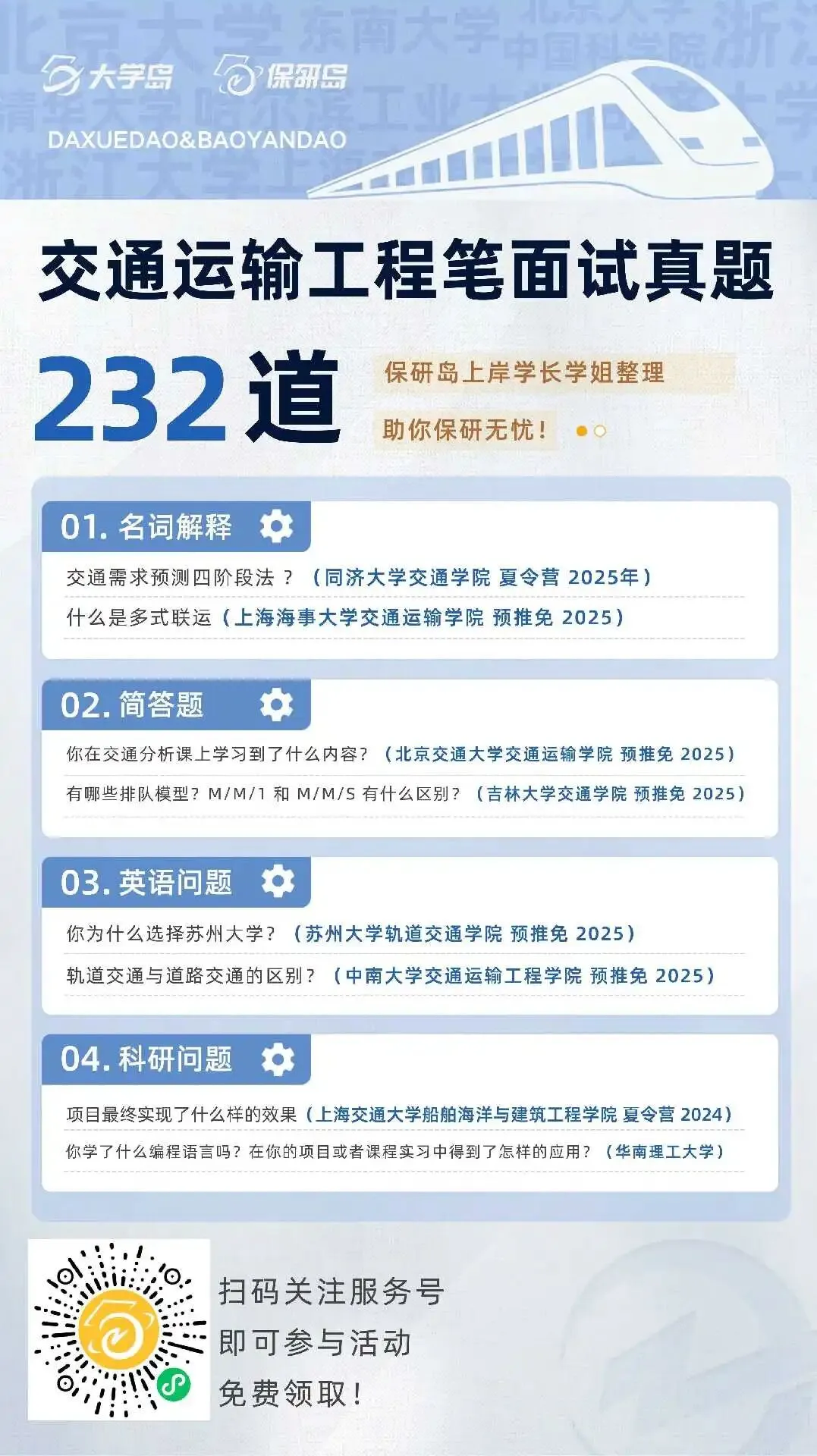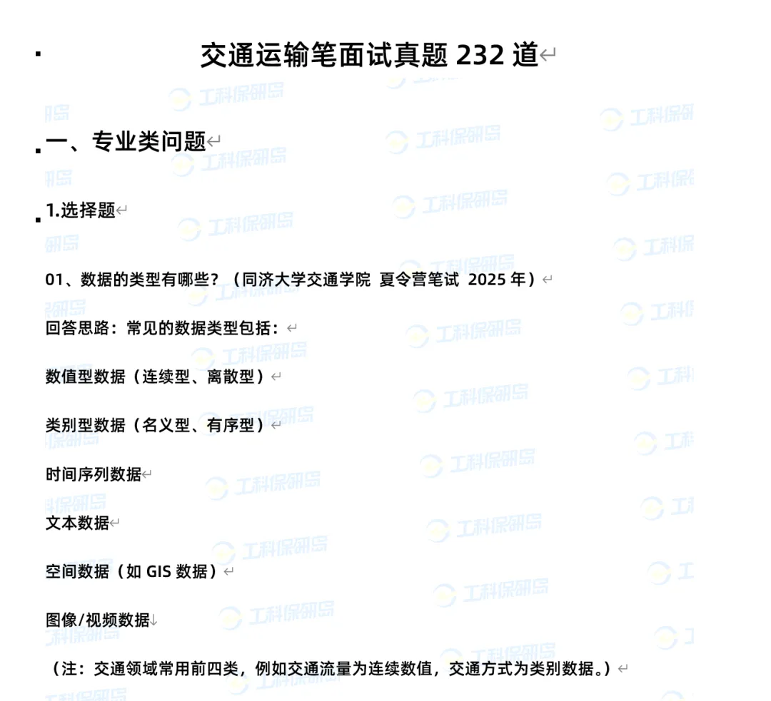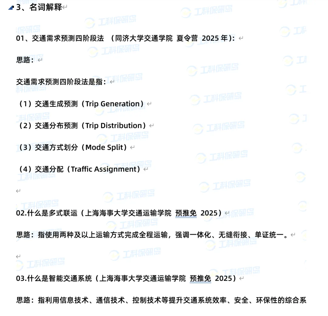 但是,交通运输工程的知识点如此之多,一个知识点可能会在名词解释、简答题等题型中反复出现。并且,每所工科院所都有自己的出题风格和考察偏好,通过往年真题,尤其是近三年的真题,进而针对性地进行备考,可能会有事半功倍的效果!
