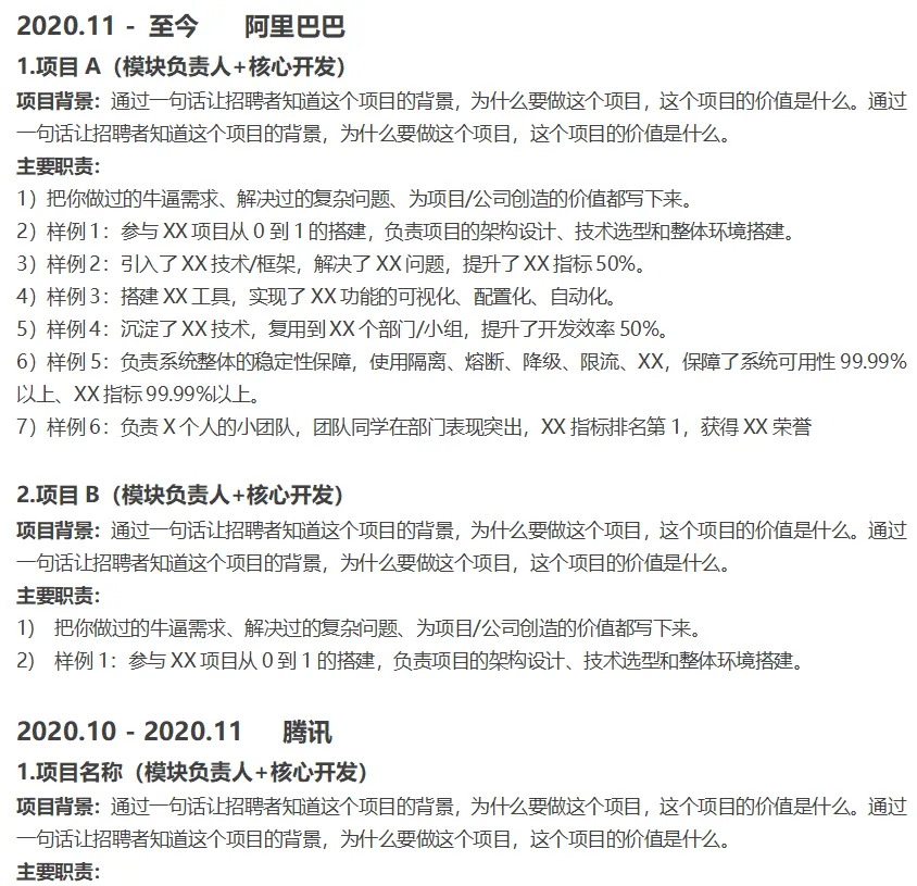主要包含几个信息:工作时间、公司名称、项目名称、担任的角色、项目背景、主要职责。