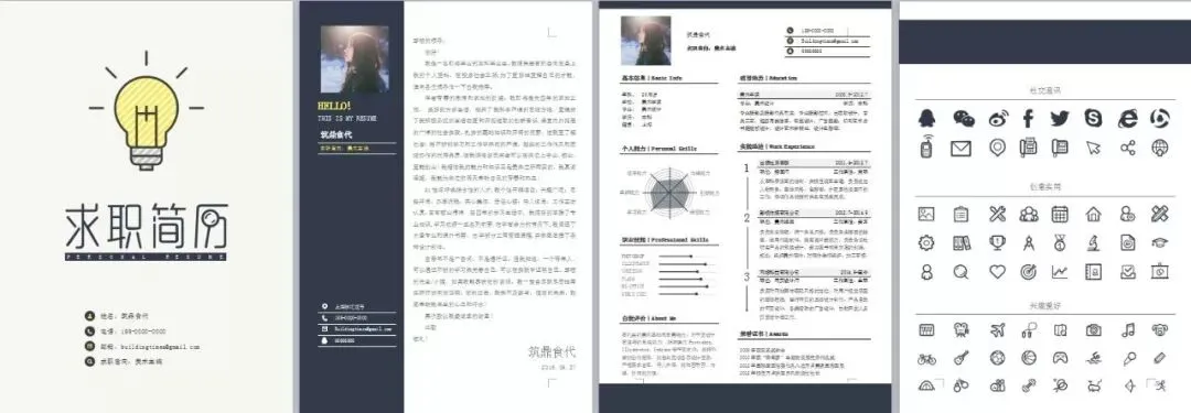 找了一个模板的图片给大家看看!这是一整套模板(三页),最后一页提供了大量的图标供大家更换、设计自己的简历模板。