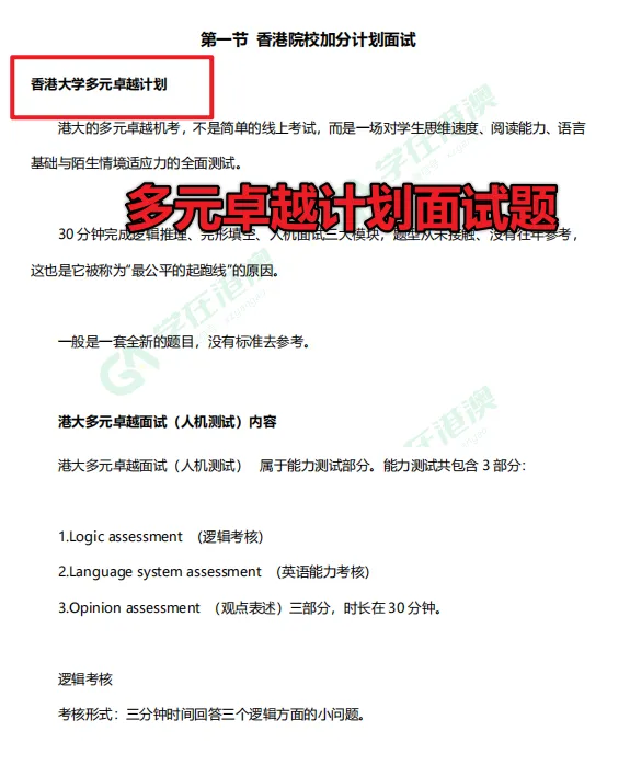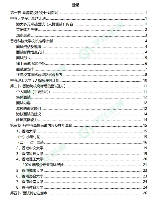 ✅ 香港院校三大加分计划面试详解:深度解析港理工“3D综评”、港大“多元卓越”等计划的面试流程、考核重点及往年真题。✅ 历年高考后面试真题汇总:覆盖各大港校高频考点,提前熟悉题型风格,做到心中有数。✅ 高频问题高分模板:针对“为何选择我们专业”“未来规划”等必问题,提供高分的回答思路与话术。✅ 小组讨论实战技巧:教你如何得体表达观点、引导讨论节奏、展现领导力与合作精神。✅ 模拟面试全流程还原:从面试礼仪到环节设置,带你提前演练,从容应对真实考场。