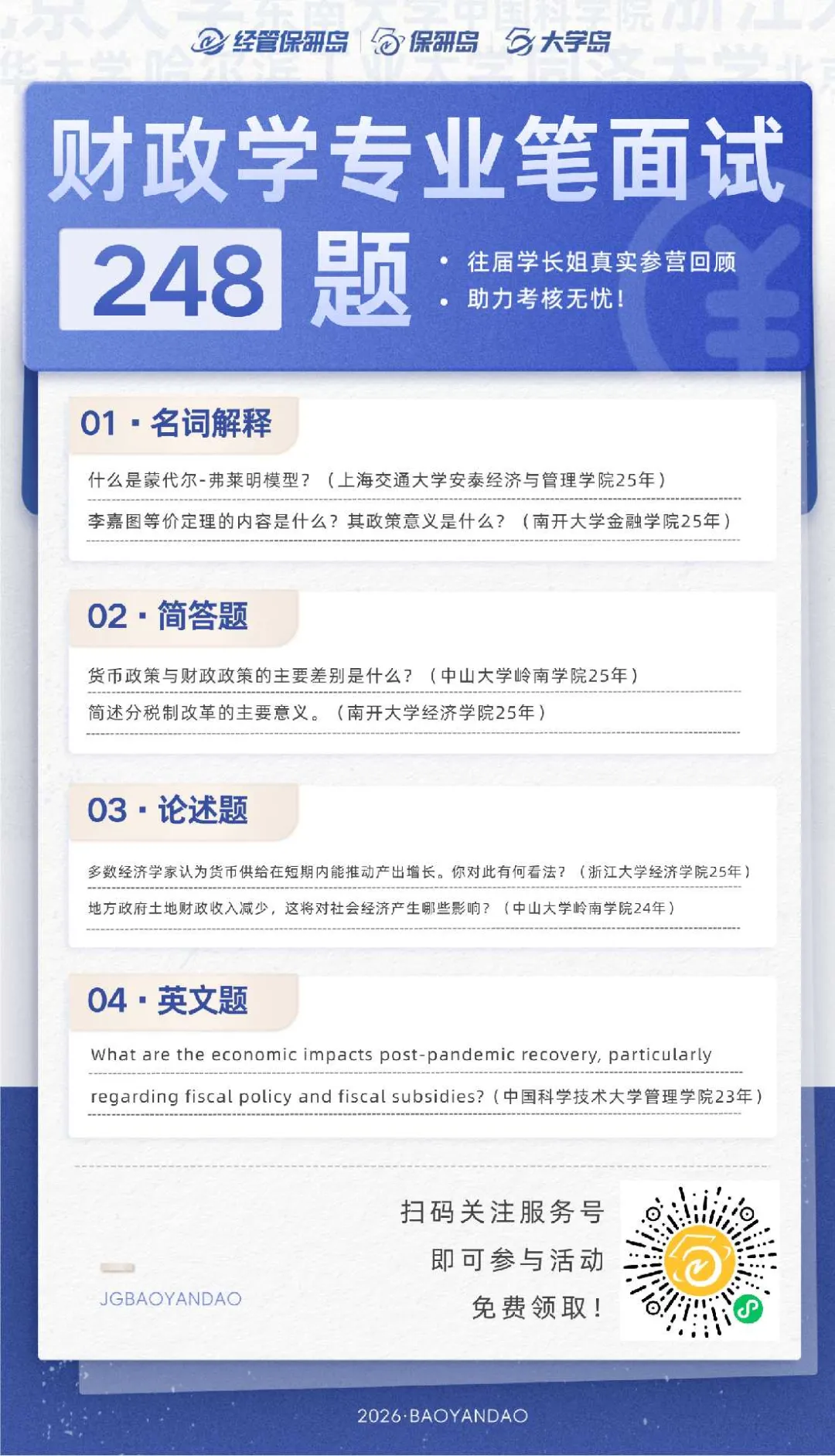 基本来说,财政学专业基本以笔面试的方式来进行考核,内容涵盖宏微观经济学、税收学、政府预算等多个方面。笔试准备需要更加全面的知识体系,注重基础理论的掌握,而面试有时会围绕你的研究方向与参营论文进行深挖,有时也会采取知识点抽题的方式进行,不同院校的考核方式与侧重点都有所差异,因此,掌握真题对财税系保研有着重大的价值。