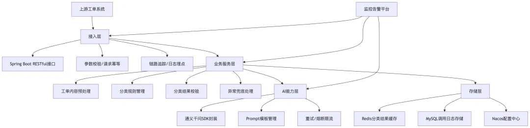 第二步,技术选型与架构设计,还是基于阿里的Java技术栈,用Spring Boot开发微服务接口,通过通义千问的API实现语义理解和分类,用Nacos做配置管理,Redis做分类结果的缓存,针对重复的工单内容,直接返回缓存的分类结果,减少token消耗。架构上分为4层:接入层(接收工单系统的调用)、业务层(工单预处理、分类逻辑)、AI能力层(封装通义千问的分类调用)、存储层(缓存分类结果、记录调用日志),分层清晰,方便后续维护。