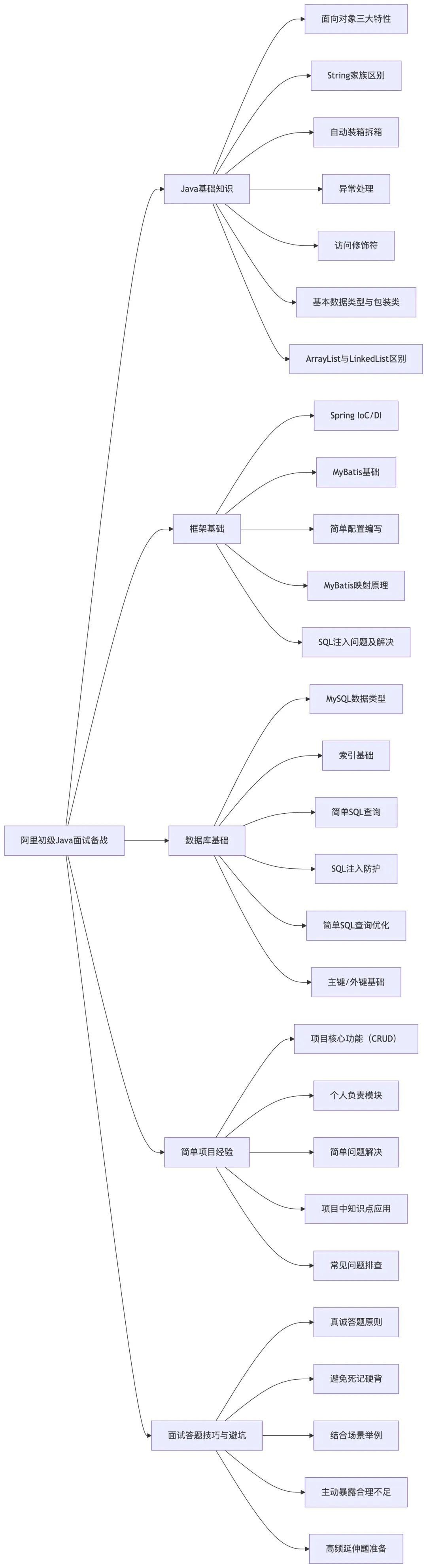 阿里初级 Java 开发,核心对接淘宝 / 天猫业务线的基础开发模块(如商品基础信息管理、订单简单操作、后台数据统计等),不涉及核心高并发、分布式架构设计,重点考察 “Java 基础是否扎实、是否具备基本的开发思维、学习能力和复盘意识”。准备阶段不用贪多求深,我按照备战核心模块梳理了完整的复盘内容,结构如下: