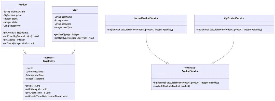 注:类图中 BaseEntity 体现了继承的复用性,Product 类的 private 属性 + public 方法体现了封装,两个实现类重写 calculatePrice 方法体现了多态
