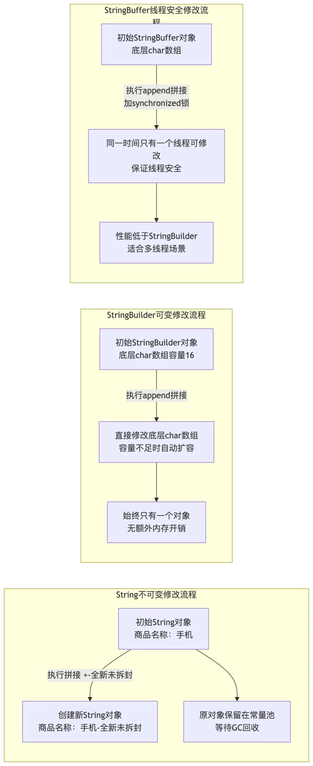 为了更清晰理解三者修改字符串时的底层差异,我整理了内存操作流程图:
