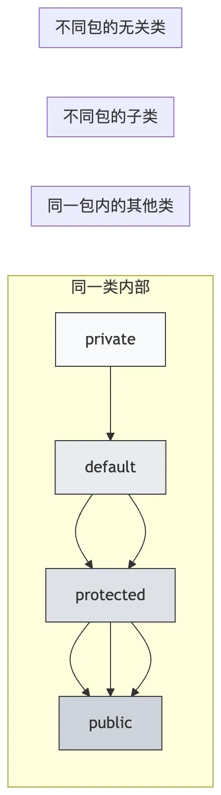 | default(无修饰符) | 同一类、同一包的类可见,不同包的类(包括子类)不可见 |