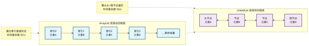 - 1. 底层实现:ArrayList 底层是动态数组(可自动扩容),LinkedList 底层是双向链表(每个元素有前驱和后继节点)。