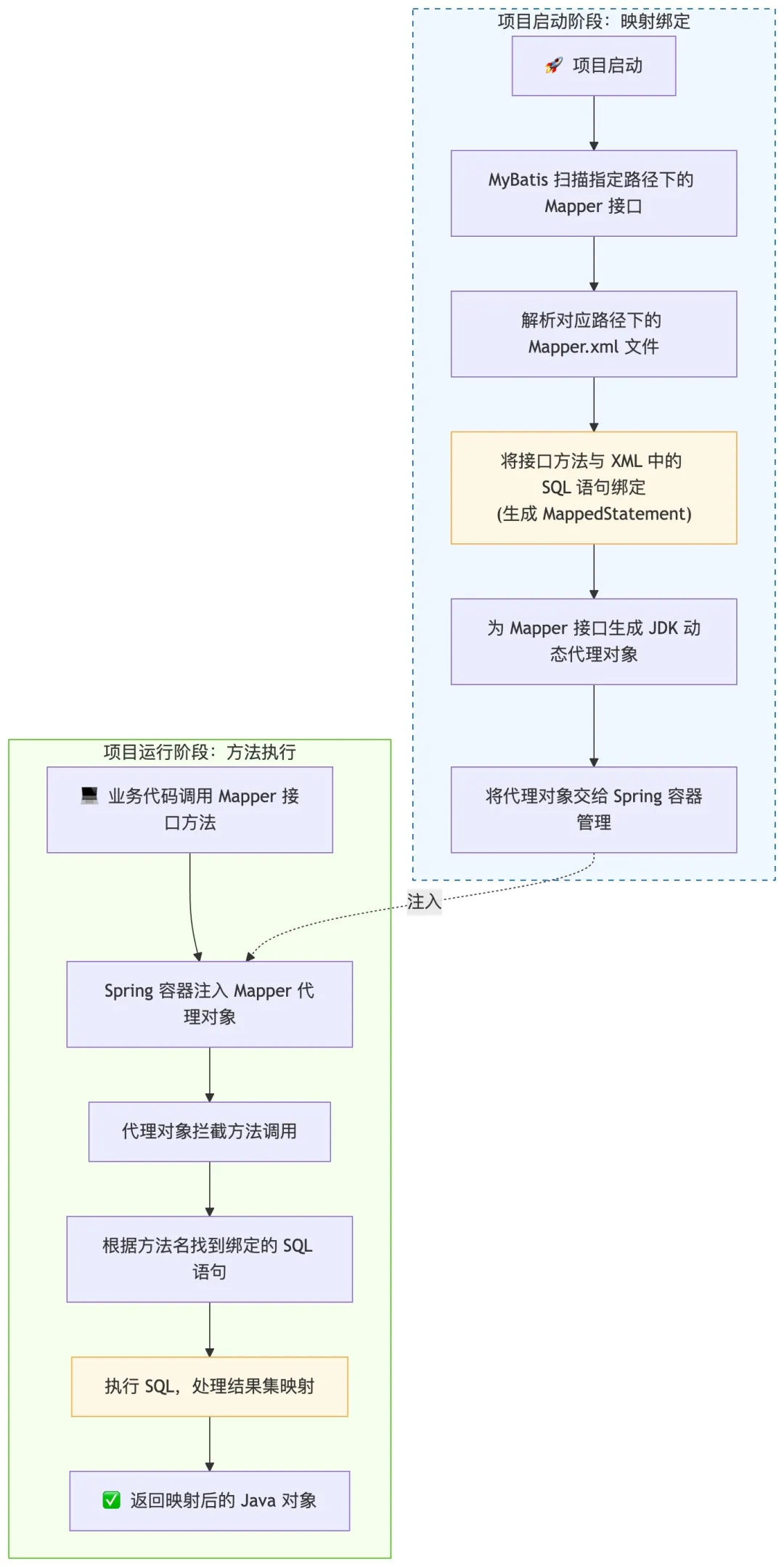 - 1. 项目启动时,MyBatis 会扫描指定路径下的 Mapper 接口和对应的 XML 文件,把接口方法和 XML 里的 SQL 语句绑定起来,生成 Mapper 接口的代理对象。