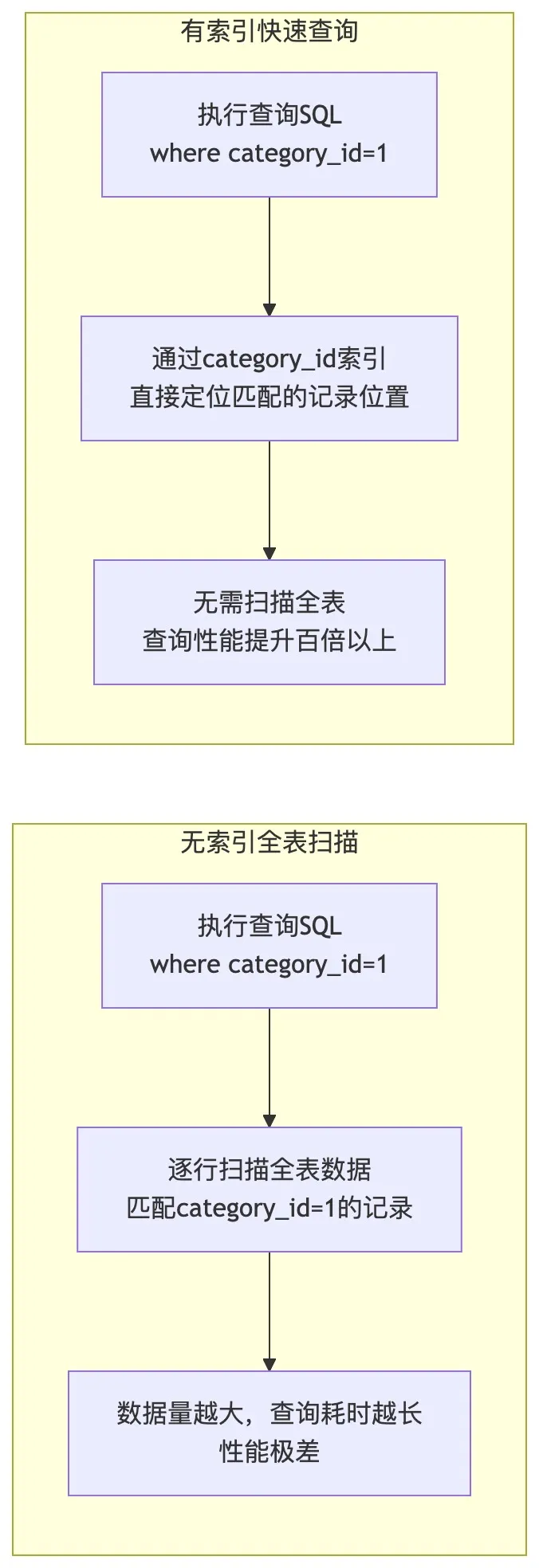 首先整理索引查询与全表扫描的性能对比流程图: