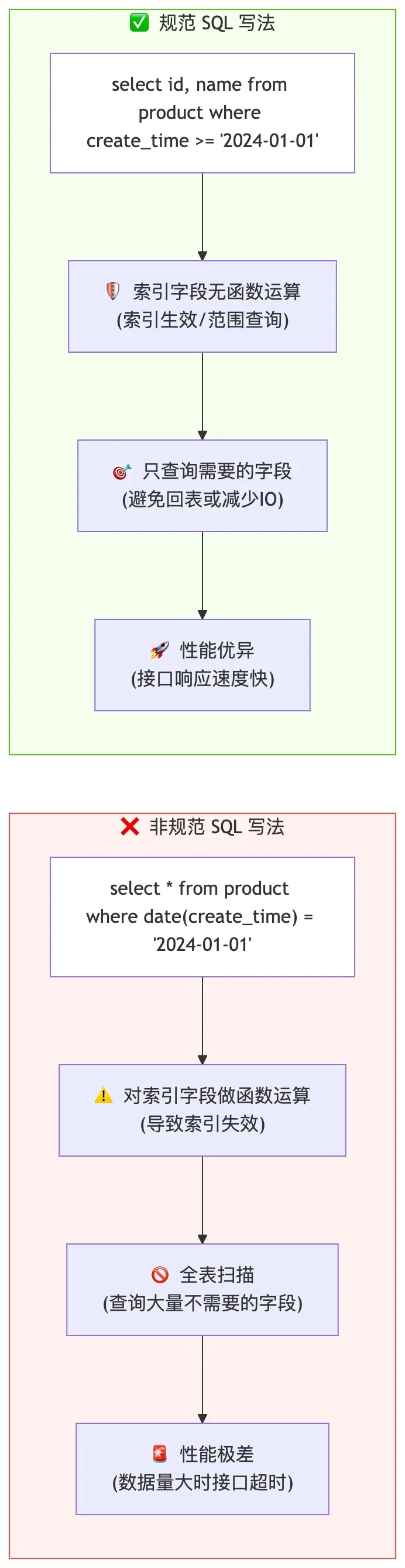 整理规范 SQL 与非规范 SQL 的执行效果对比流程图: