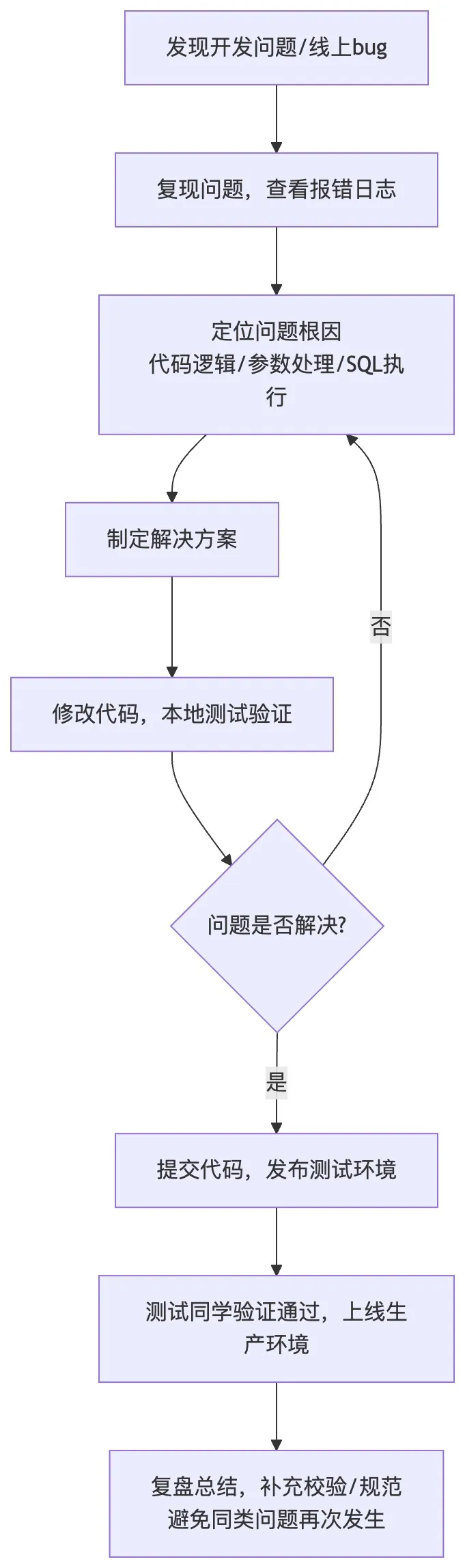 结合这三个典型问题,整理了开发问题排查与解决的通用闭环流程图: