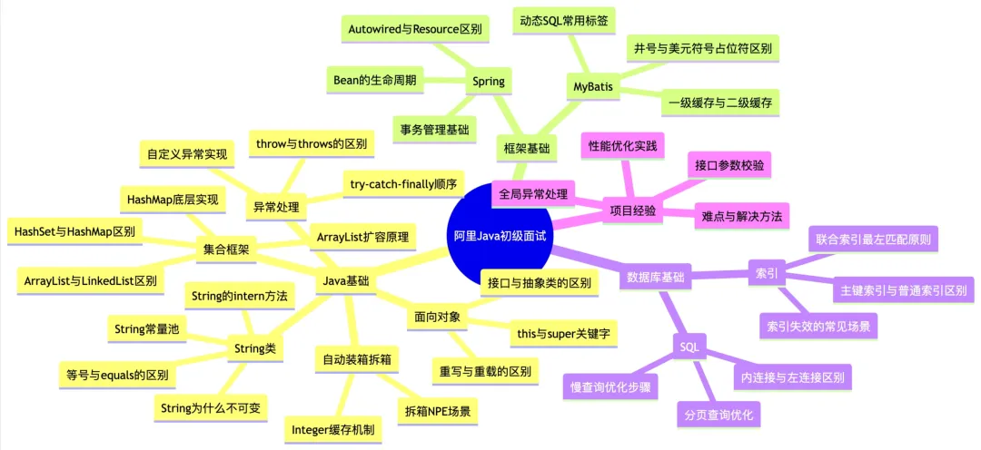 整理初级 Java 面试核心知识点的延伸考点思维导图,提前准备全覆盖:
