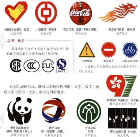 现代社会生活中常见的标志可以分为两大类:一是国家、城市、企业、商品、团体、活动、机构等类型的标志,一是交通、安全、场馆、产品使用、质量、操作等类型的公共标志。