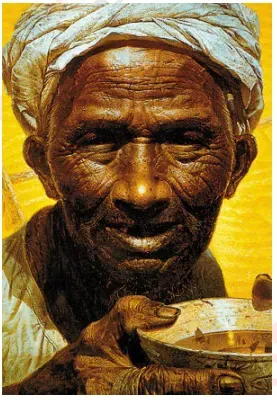教师总结:画面中人物形象面色枯黑,干瘦的脸上和手上布满了皱纹,背景的金黄色和人物的眼神相得益彰,透露出一丝无奈以及对未来的殷切希望。