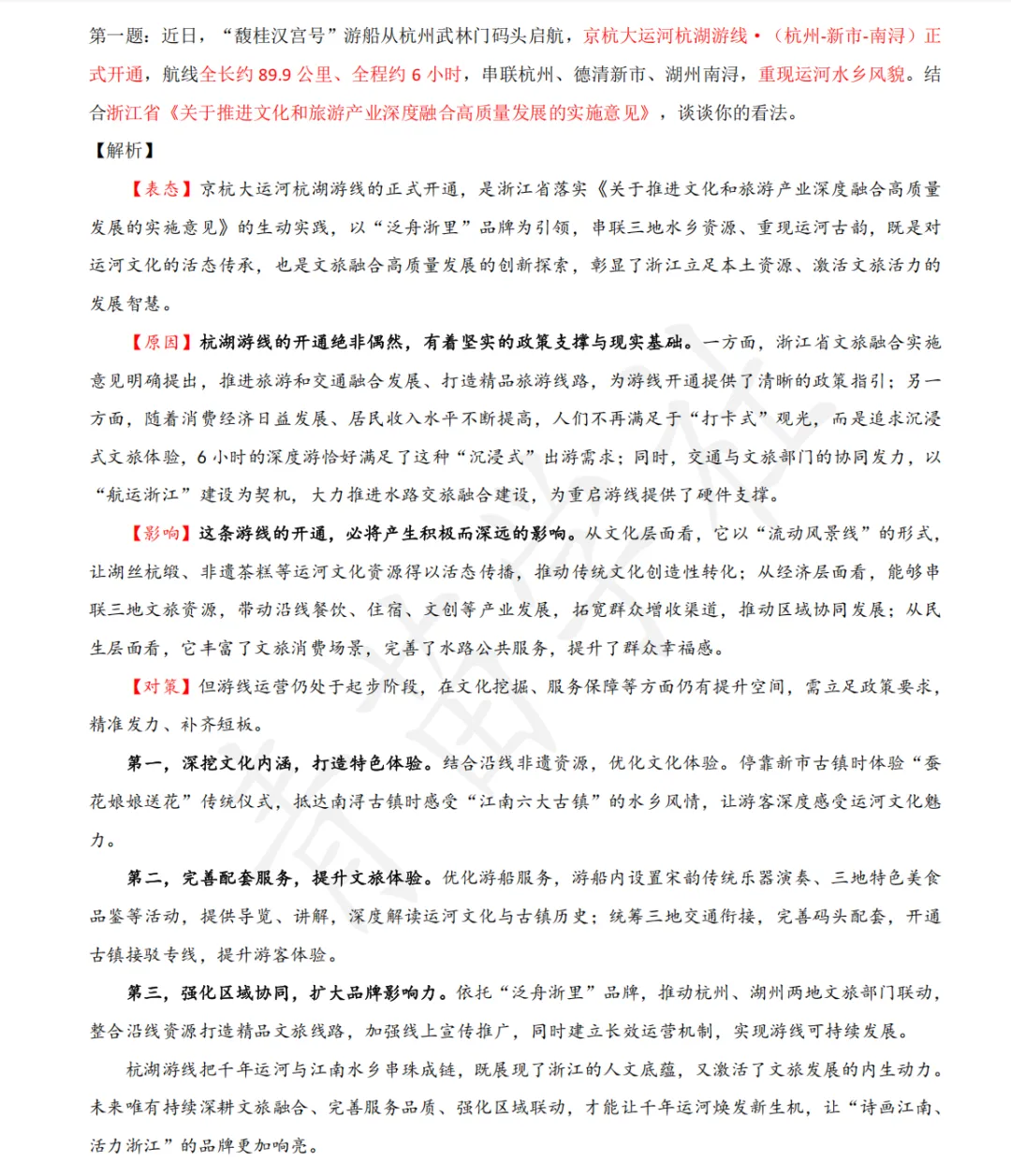 第一题:近日,“馥桂汉宫号”游船从杭州武林门码头启航,京杭大运河杭湖游线·(杭州-新市-南浔)正式开通,航线全长约89.9公里、全程约6小时,串联杭州、德清新市、湖州南浔,重现运河水乡风貌。结合浙江省《关于推进文化和旅游产业深度融合高质量发展的实施意见》,谈谈你的看法。