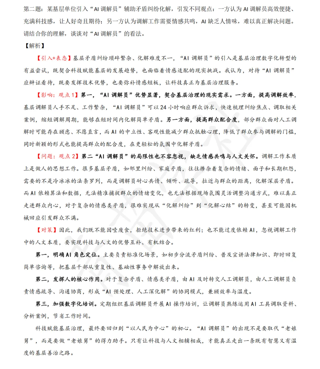第二题:某基层单位引入“AI调解员”辅助矛盾纠纷化解,引发不同观点:一方认为AI调解员高效便捷、充满科技感,让人好奇且期待;另一方认为调解工作需要情感共鸣,AI缺乏人情味,难以真正解决问题。请结合你的理解,谈谈对“AI调解员”的看法。