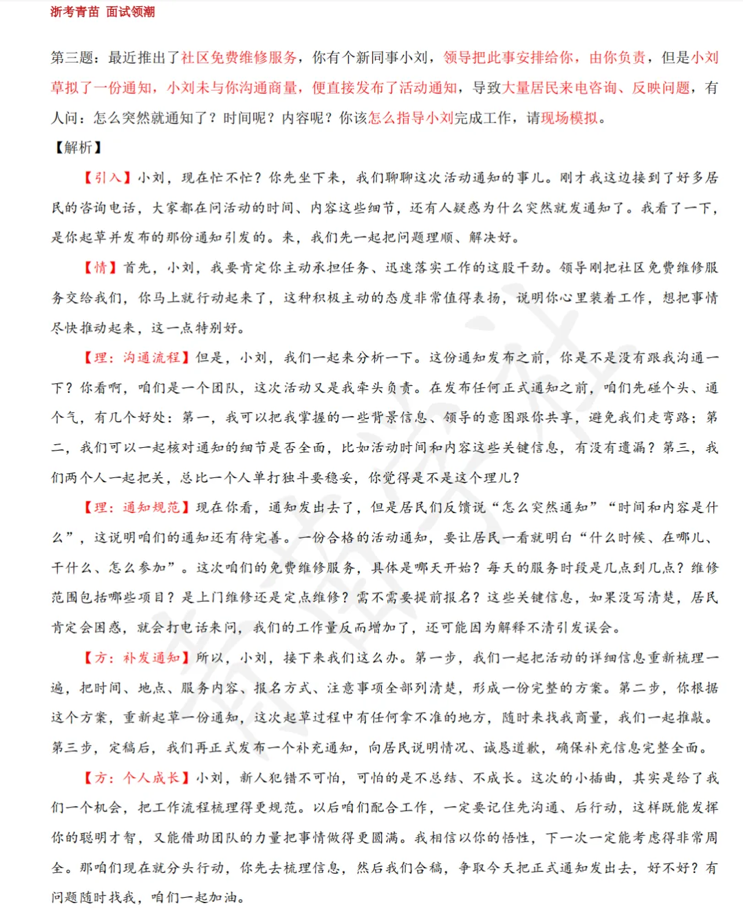 第三题:最近推出了社区免费维修服务,你有个新同事小刘,领导把此事安排给你,由你负责,但是小刘草拟了一份通知,小刘未与你沟通商量,便直接发布了活动通知,导致大量居民来电咨询、反映问题,有人问:怎么突然就通知了?时间呢?内容呢?你该怎么指导小刘完成工作,请现场模拟。