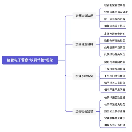 对于电子警察“以罚代管”现象,我认为还需综合施策,让电子警察回归执法利器的职能定位,真正成为百姓人身安全的守护神,而非增收创收的提款机。