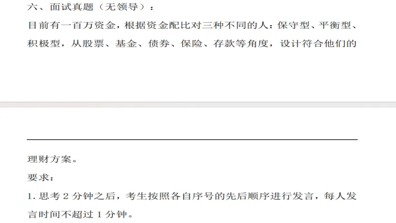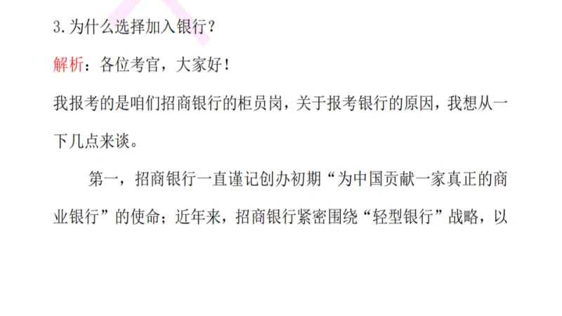 2026年招商银行春招面试部分初面已经进行了,正常招商银行春招面试最少是两轮的,不排除三轮的可能性,面试形式主要是半结构化(包含AI面试和演讲)+无领导小组+对抗赛,历年招商银行的面试真题+解析,都是十三年以上面试经验的李老师亲自解析;视频也录制到位,半结构化面试+无领导小组面试+对抗赛,包含自我介绍、求职动机、人际关系、演讲、时政热点、无领导小组、对抗赛等常考题型,当然除去视频以外,还有讲义和经济金融面试热点话题。 要李老师视频的同学,可以有答疑,也可以免费修改自我介绍,都是李老师负责;单要真题,没有这个福利!寻求免费的同学勿扰!