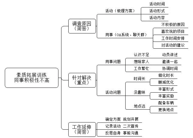 第一,调查了解原因。一方面梳理素质拓展训练活动方案,了解活动开展时间、内容以及相关方式,做到心中有数。另一方面通过单位内网、微信群等方式向大家发送调查问卷,走访不同科室,了解大家积极性不高的原因以及对于本次训练的看法和建议,并认真做好记录。