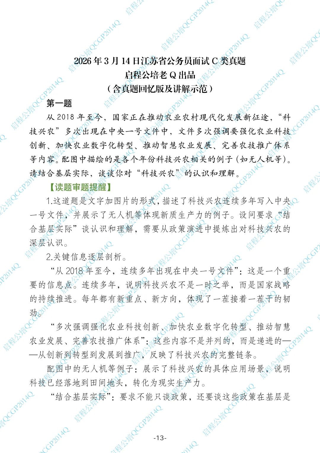 1.这道题是文字加图片的形式,描述了科技兴农连续多年写入中央一号文件,并展示了无人机等体现新质生产力的例子。设问要求“结合基层实际”谈认识和理解,需要从政策演进中提炼出对科技兴农的深层认识。
