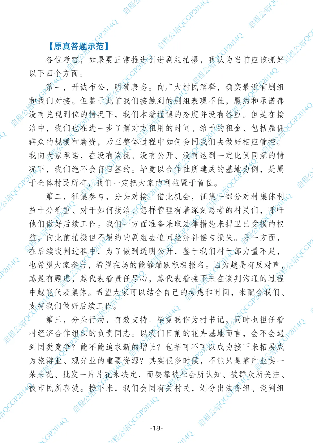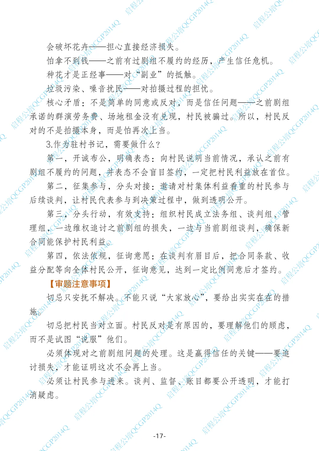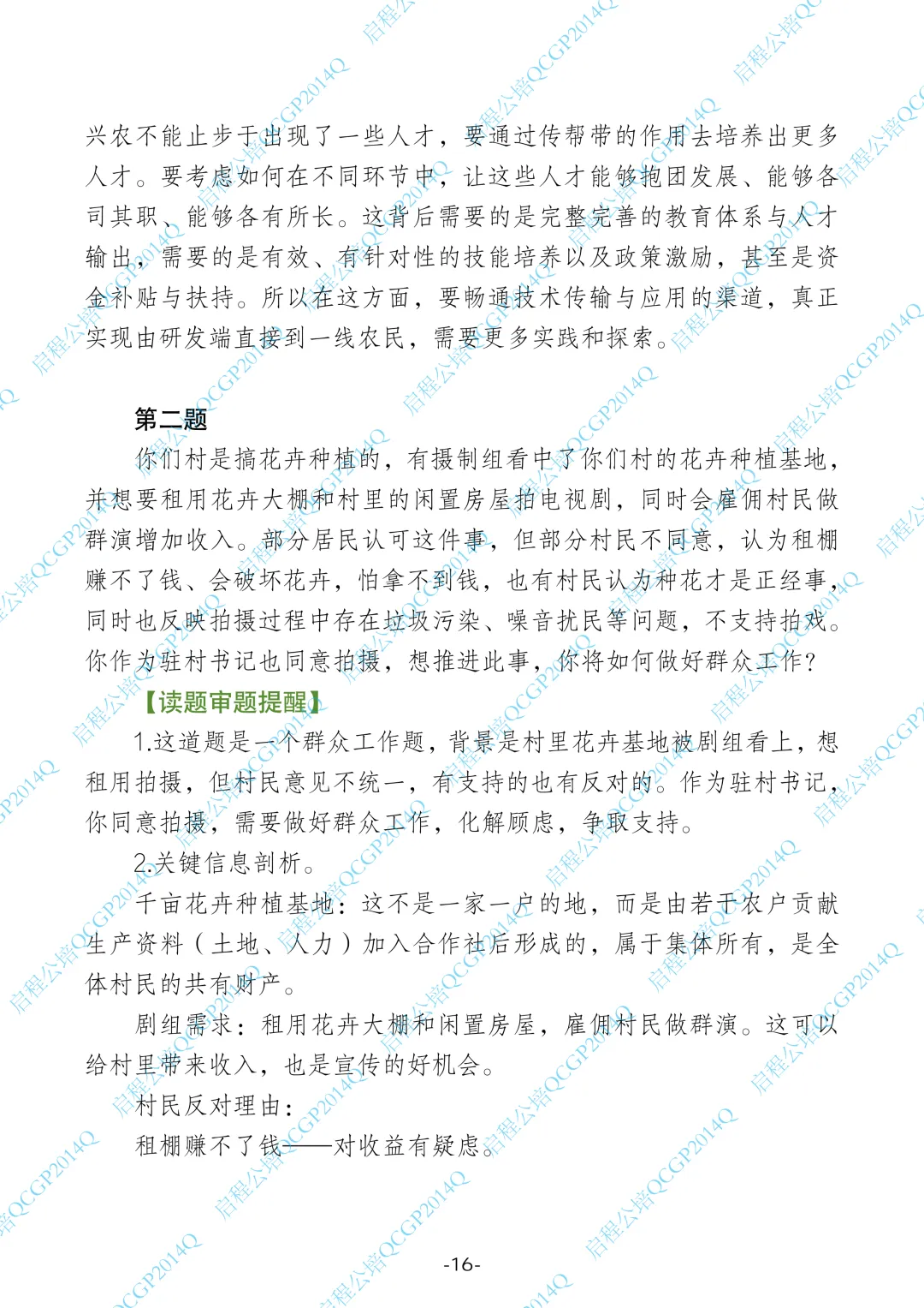 1.这道题是一个群众工作题,背景是村里花卉基地被剧组看上,想租用拍摄,但村民意见不统一,有支持的也有反对的。作为驻村书记,你同意拍摄,需要做好群众工作,化解顾虑,争取支持。