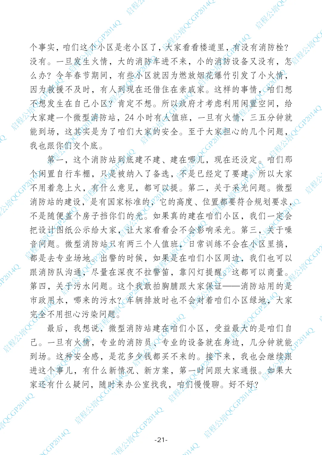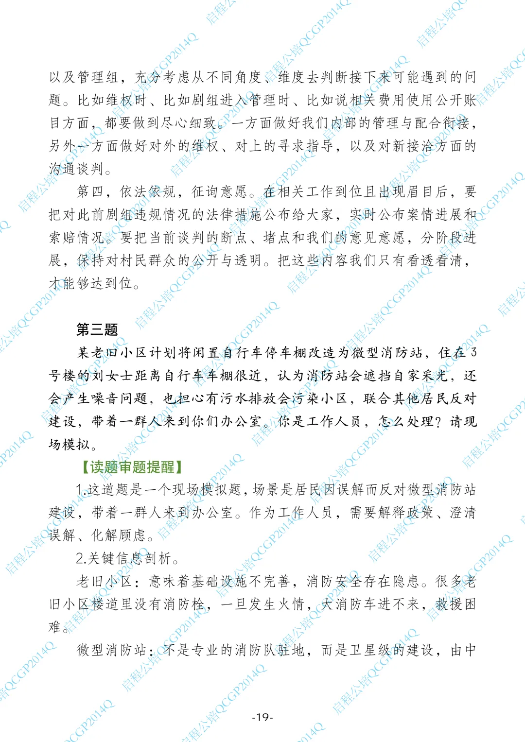 1.这道题是一个现场模拟题,场景是居民因误解而反对微型消防站建设,带着一群人来到办公室。作为工作人员,需要解释政策、澄清误解、化解顾虑。