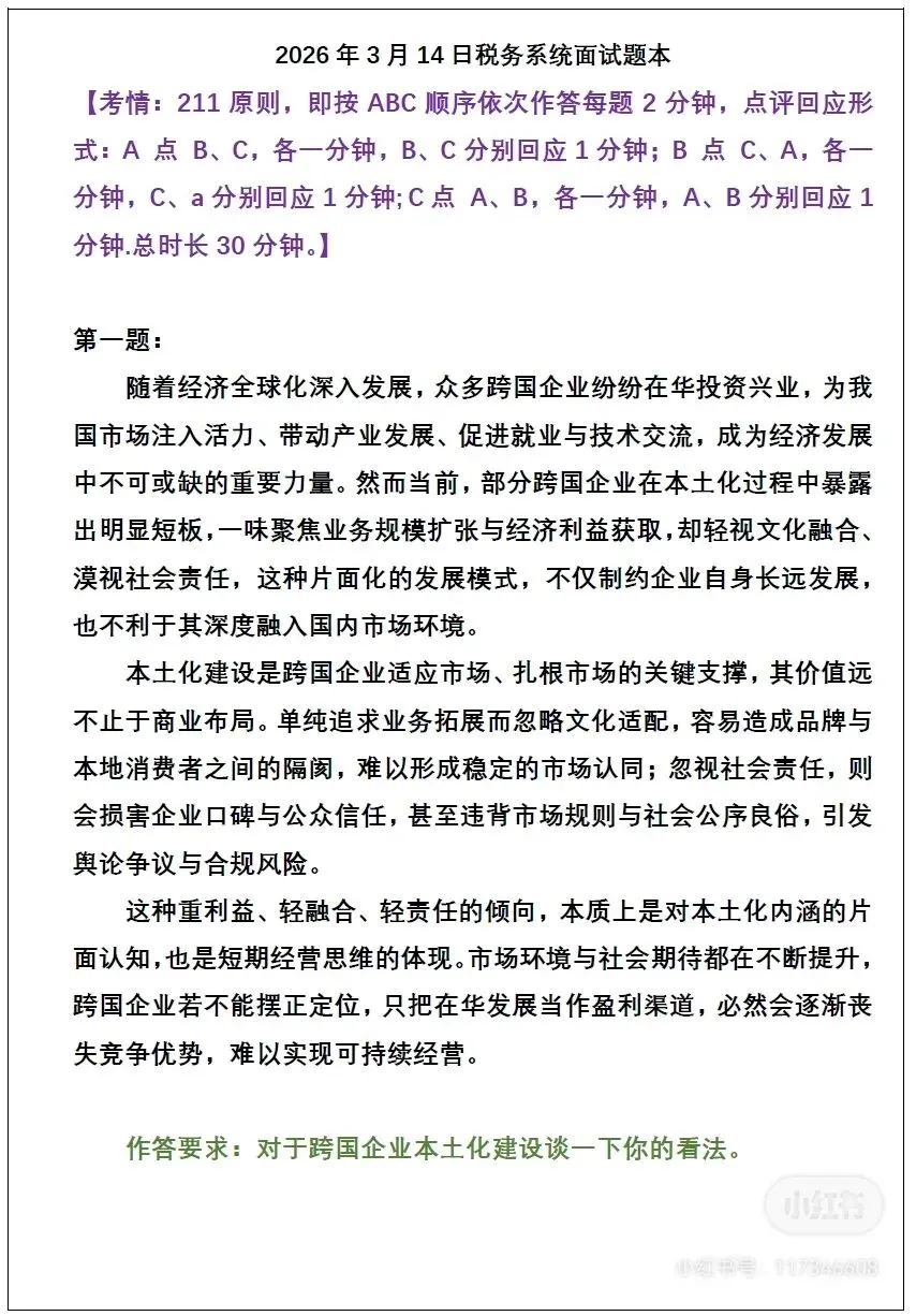 真题227:请谈谈你对跨国企业本土化的认识.(2026年3月14日税务考生回忆版)
